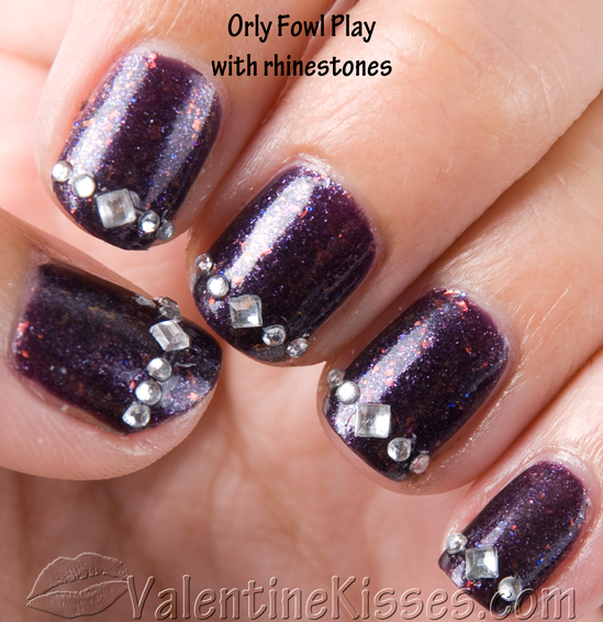 Anyhow, I searched high and low for Orly Fowl Play in stores within an hour of me, and nobody had it! I finally gave in and ordered it directly from Orly's website (along with a back-up bottle of Fowl Play, and two other shades to make shipping worth the purchase). I used it the day I received it, then decided to play around with some rhinestones.