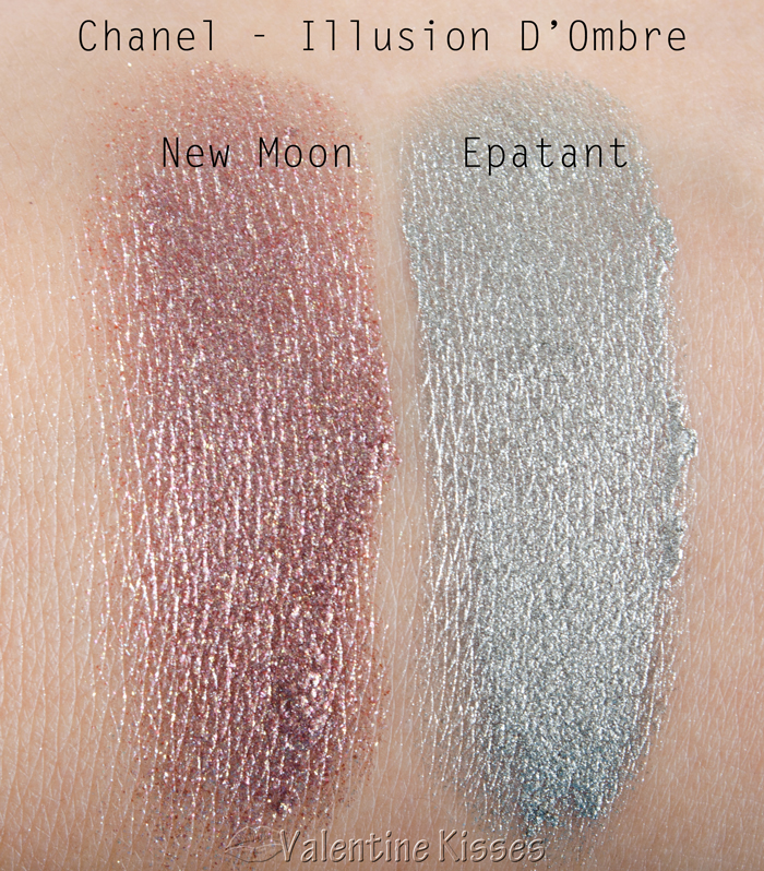 I wanted to get more shades, but without seeing them in person I couldn't be too sure. Since I was at a Chanel counter, I swatched them all and decided on just one, the shade Epatant (and I keep wanting to call it elephant). So you will see the shade Epatant in the pics as a brand new, un-touched product (still with its box), and then you'll see a comparison and swatches of New Moon next to Epatant, and New Moon has been used a bunch.