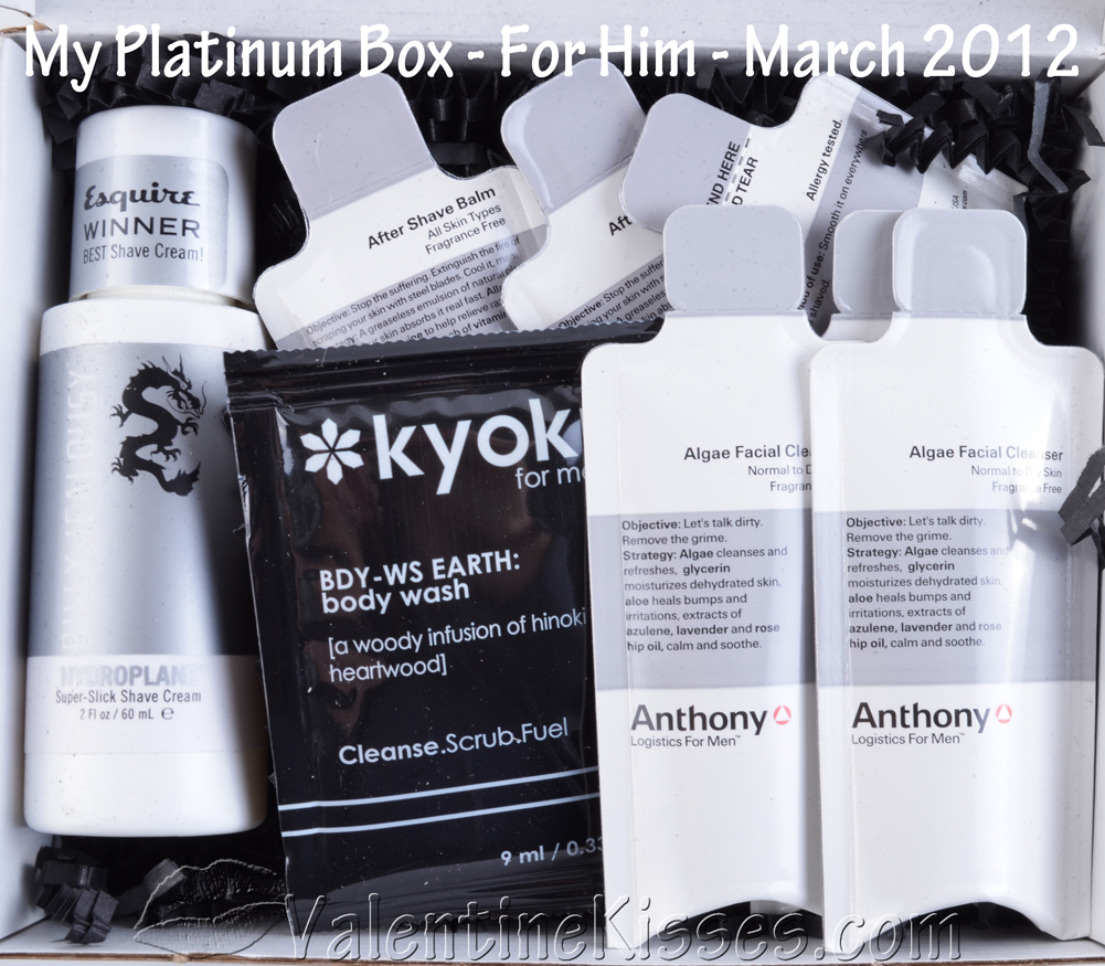 With all the beauty sampling programs out there for us girls, it's easy to forget that there are programs specifically for the men in our life -- such as My Platinum Box. They offer a men's and a women's box, but in this post I'll show you the March 2012 Box For Him.